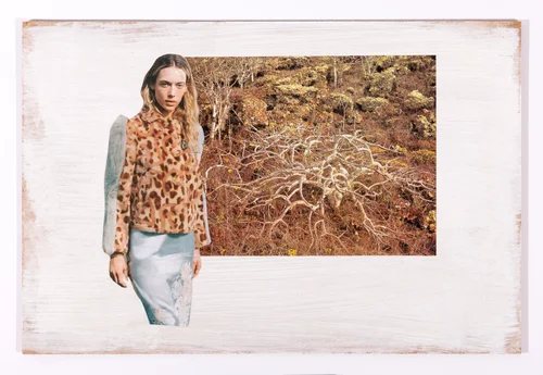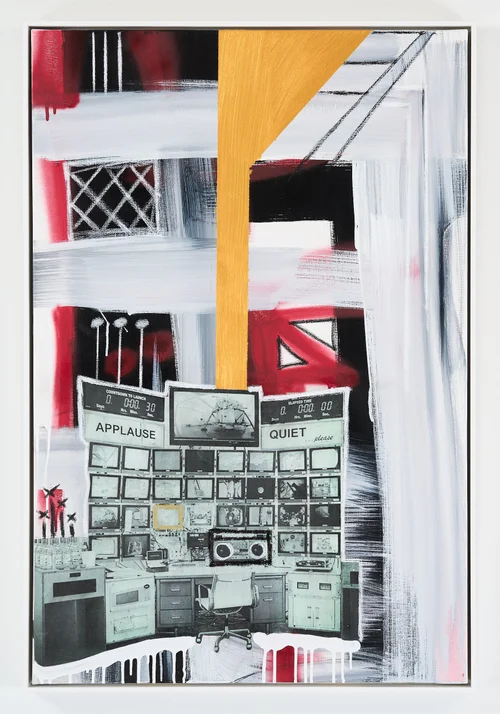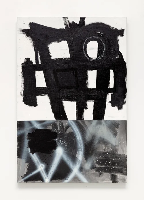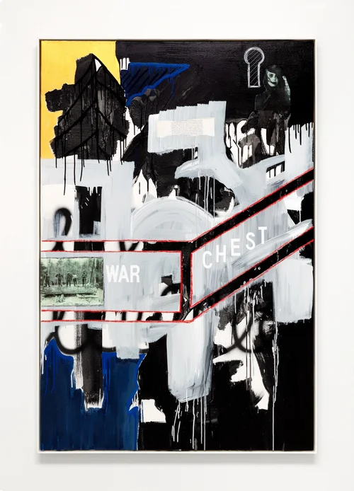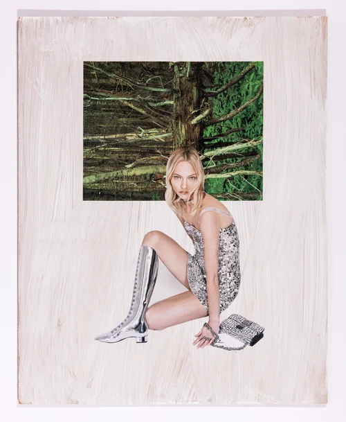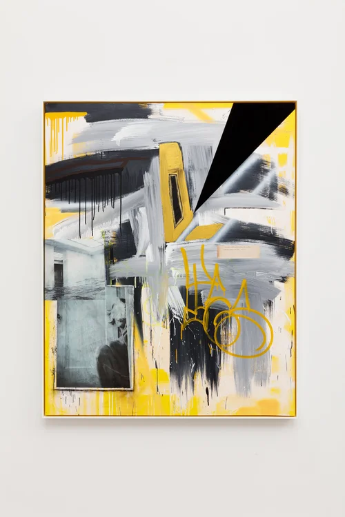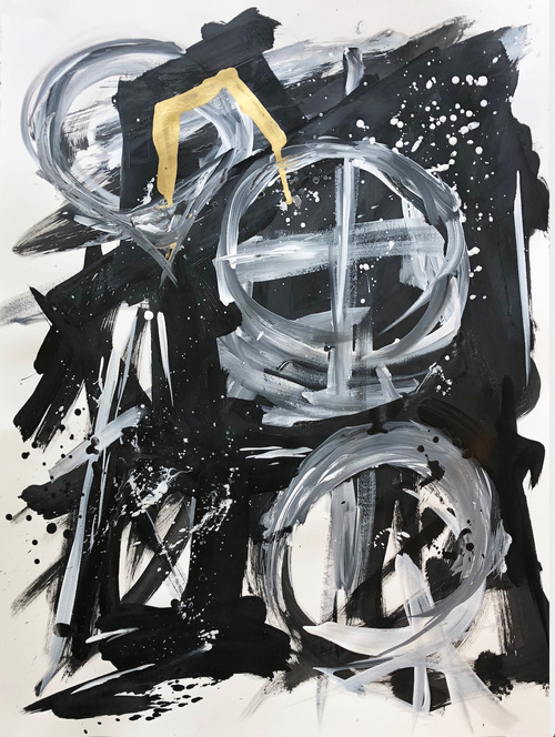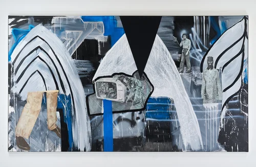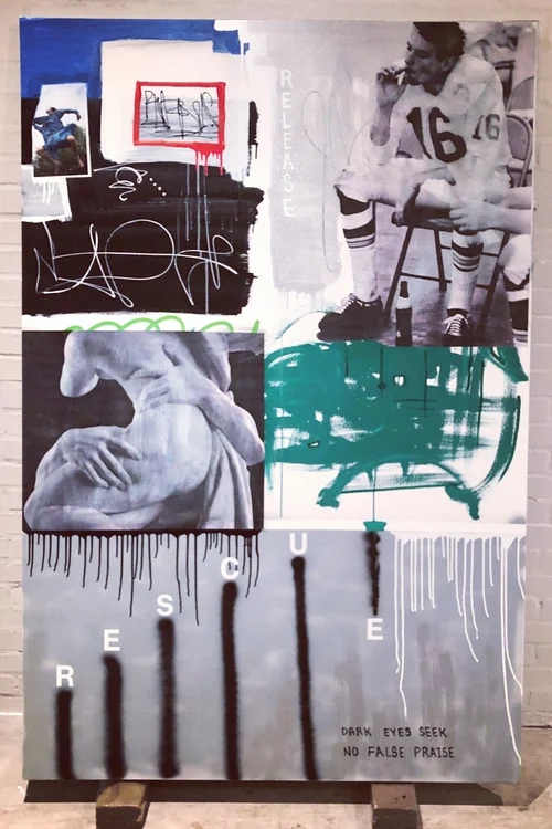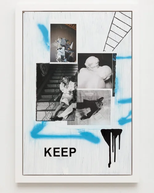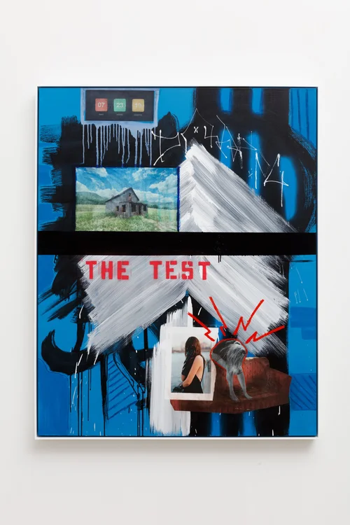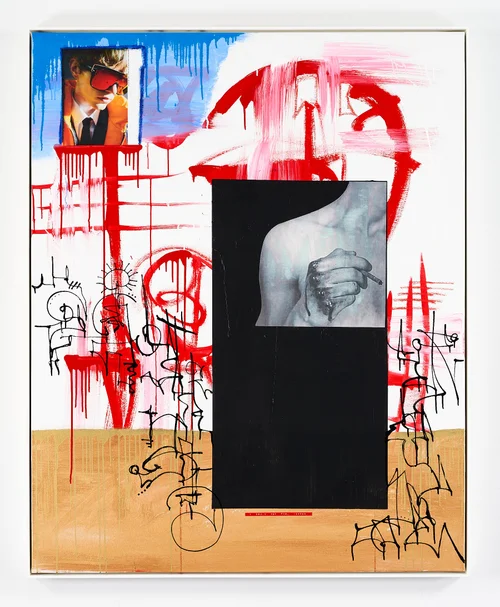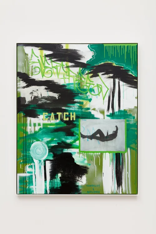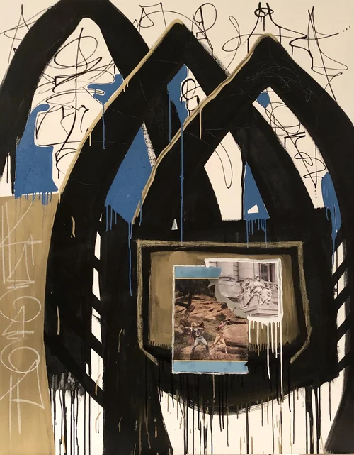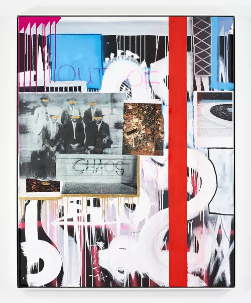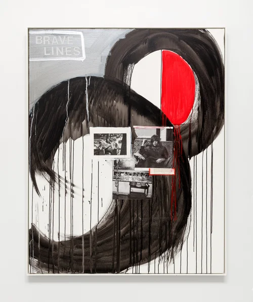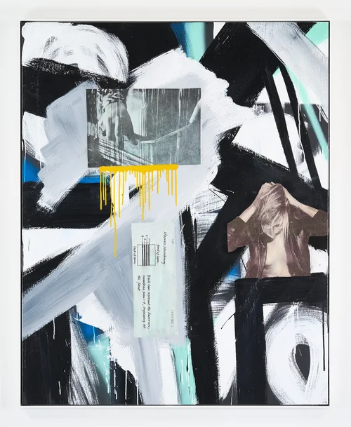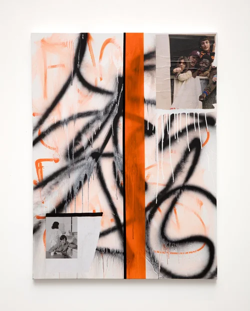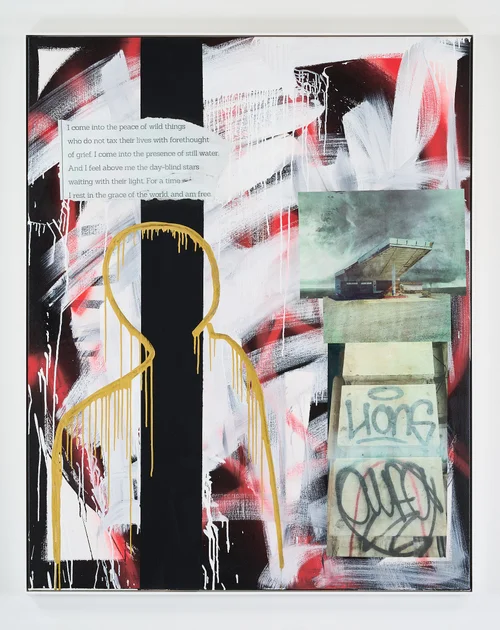 Transitioning from his subterranean career as a street artist in Los Angeles, Atkinson retained many of his artistic processes—on canvas he works with expediency, often completing a piece in as little as one or two sessions, imbuing his work with a visceral physicality and emotive power. In work like Texas Series #1, swaths of raw canvas background seemingly haphazard brush strokes—a collaged photograph of shadowy trees drives mystery into the work’s illusive narrative. Drawing inspiration from Abstract Expressionist painters like Franz Kline and Beat poetry—the exhibition’s title, On the Road, referencing Jack Kerouac’s jazzy opus—his techniques privilege painterly force. Atkinson’s artistic practice pushes the limits of his body and tools towards their breaking points.