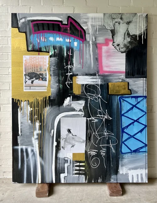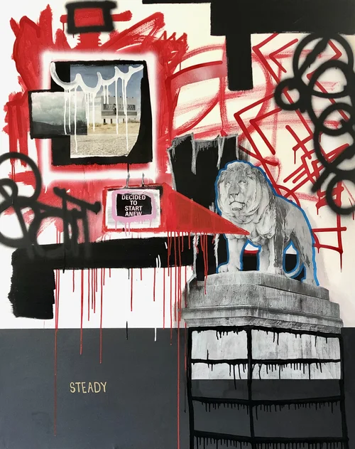 William first exhibited his work publicly on the streets of Los Angeles. As he progressed into fine art exhibition, William always wanted to keep true to this initial form of expression. His first gallery exhibitions incorporated found objects with imagery rooted in street art. William has evolved into fine art but he maintains a connection to his early works. Street art forced William to create in a single expressive moment. He continues this practice in his current studio work, making large scale pieces in one session. While many artists create a piece over days or months, William does not revisit any of his pieces once the initial emotion has passed, ensuring it captures the energy of that single expressive moment. He works across multiple mediums with a consistent tone and voice echoing his early artistic roots.